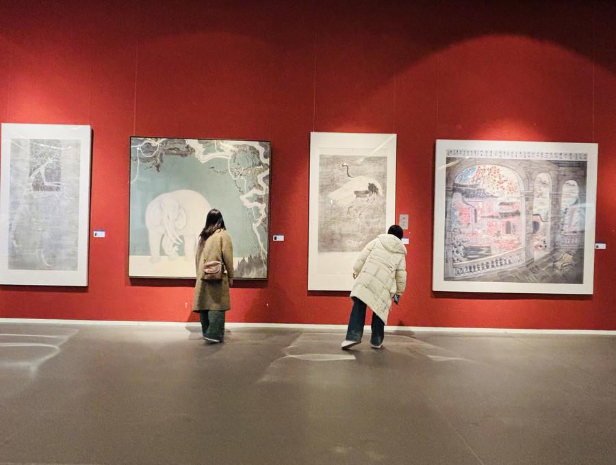 24日、天津美術館「芸術が語る青春-海峡両岸・香港・マカオ青年芸術家作品交流展」で作品を見る人たち。(天津=新華社記者/周潤健)