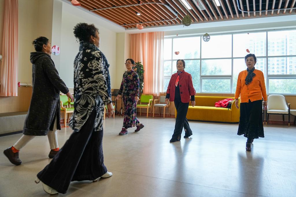 23日、張店区馬尚街道金石社区のデイケアセンターで、体を動かす高齢者たち。(淄博=新華社記者/朱崢)