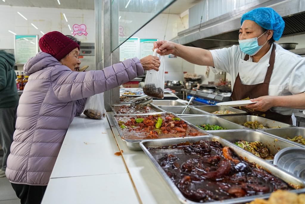 23日、張店区馬尚街道博大花園社区の高齢者食堂で、持ち帰り用の食事を受け取る高齢者。(淄博=新華社記者/朱崢)