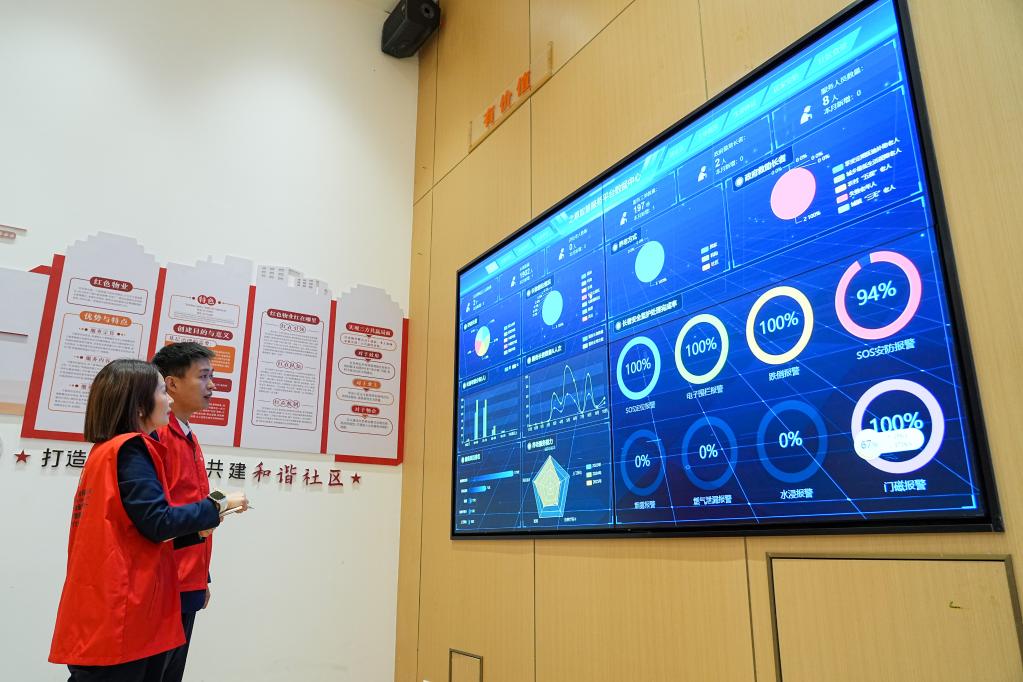 23日、張店区馬尚街道金石社区で、モノのインターネット(IoT)を使った高齢者の見守りシステムをチェックするスタッフ。異常があれば自動的に通知される仕組みだ。(淄博=新華社記者/朱崢)