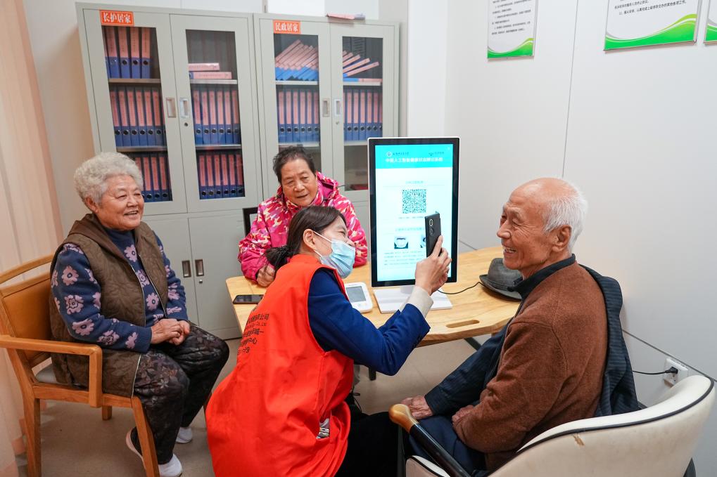 23日、張店区馬尚街道金石社区で、高齢者に在宅健康チェックサービスを提供するスタッフ。測定したデータは高齢者の家族の携帯電話に自動的に送られる。(淄博=新華社記者/朱崢)