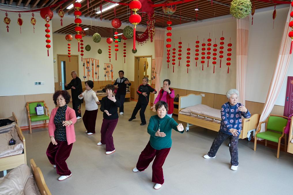 23日、張店区馬尚街道金石社区のデイケアセンターで太極拳に励む高齢者たち。(淄博=新華社記者/朱崢)