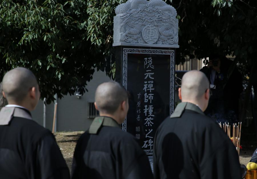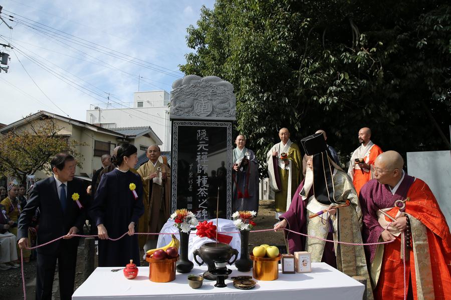 4日、第2回隠元禅師大茶会で行われた「隠元禅師種茶之碑」の除幕式。(宇治=新華社記者/岳晨星)