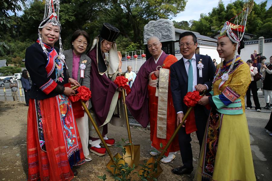 4日、第2回隠元禅師大茶会で、茶樹の植樹をするゲストら。(宇治=新華社記者/岳晨星)