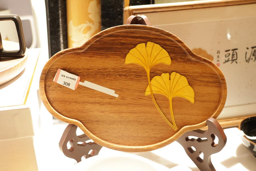 5日、国家級無形文化遺産に登録されている掐絲琺瑯(こうしほうろう)の技法を使って嘉定区で制作されたイチョウ葉をかたどった皿。(上海=新華社記者/藍建中)