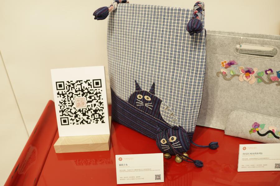 5日、国家級無形文化遺産に登録されている烏泥涇の手織り布を使ったハンドバッグ。(上海=新華社記者/藍建中)