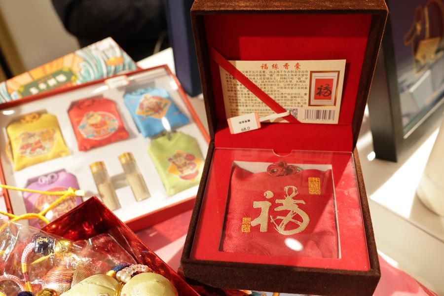 5日、栄慶堂(楊浦区)の香袋。制作技法は上海市の無形文化遺産に登録されている。(上海=新華社記者/藍建中)