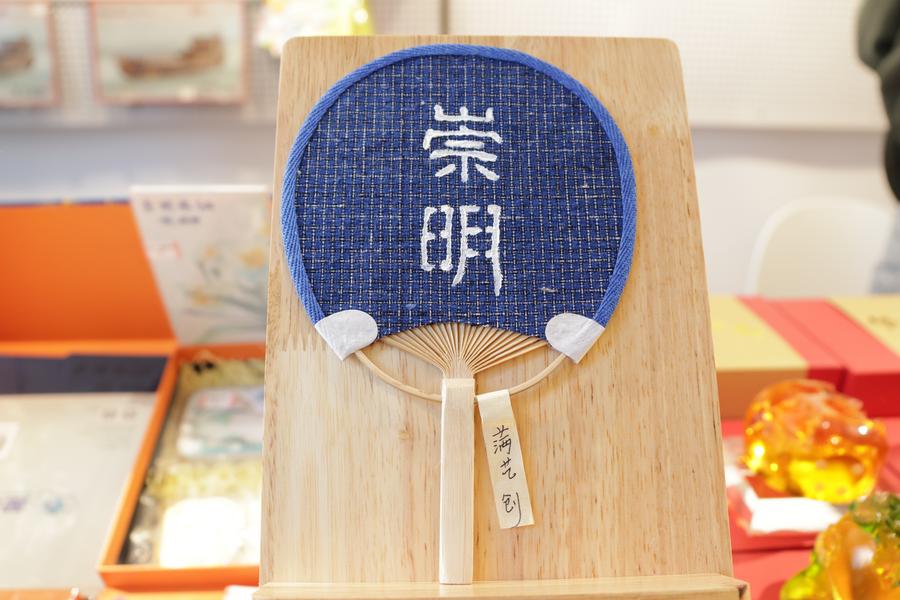 5日、上海市崇明区で生産された手織り布を使ったうちわ。(上海=新華社記者/藍建中)