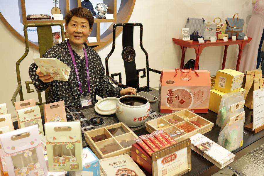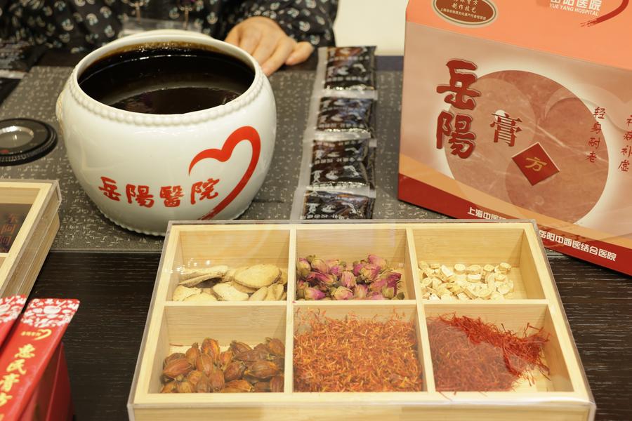 5日、上海中医薬大学付属岳陽医院が手がける特色ある中医薬ブランド「岳陽膏方(こうほう)」のブース。(上海=新華社記者/藍建中)