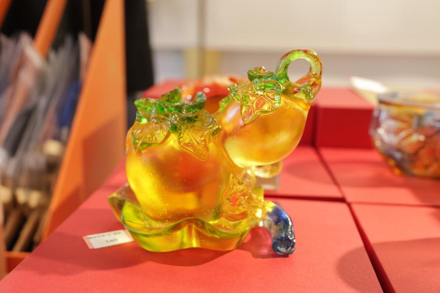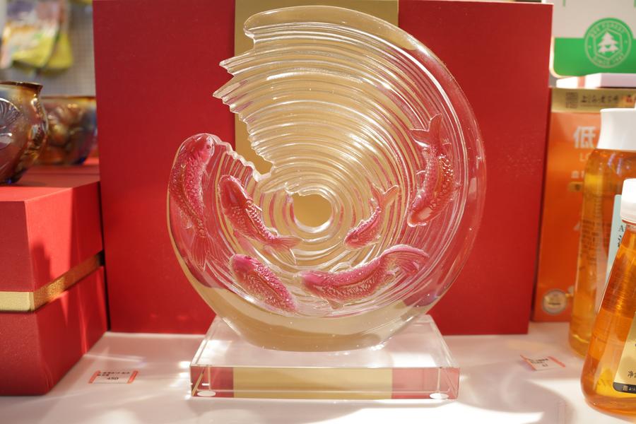 5日、メディアセンターに展示された上海のガラス工芸品。黄浦、奉賢両区に伝わる焼成技術は市の無形文化遺産に登録されている。(上海=新華社記者/藍建中)