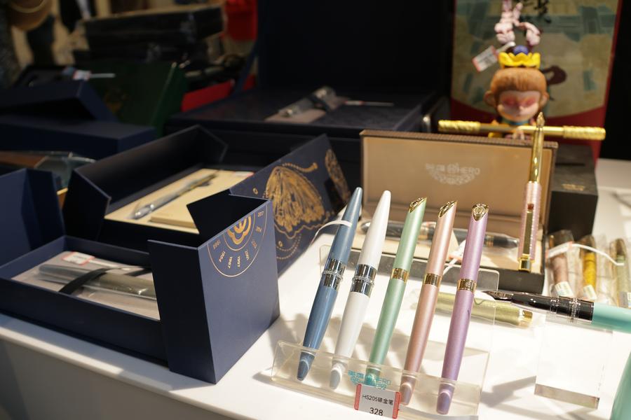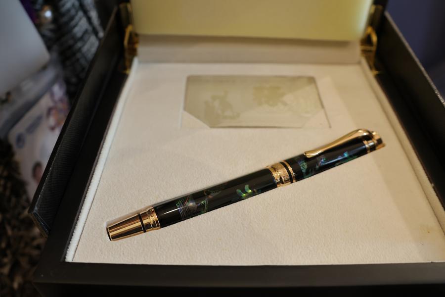 5日、上海を代表するブランド「英雄」の螺鈿(らでん)細工を施した万年筆。(上海=新華社記者/藍建中)