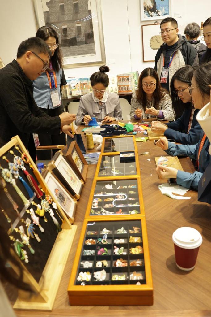 5日、盤扣(パンコウ=チャイナボタン)作りを体験する記者ら。(上海=新華社記者/藍建中)