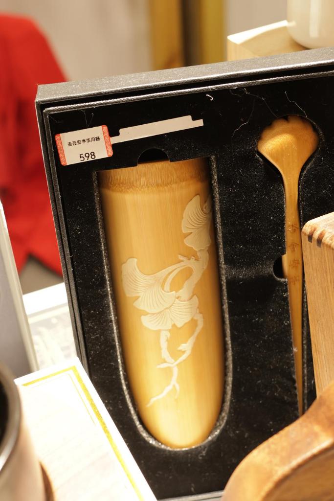 5日、嘉定区で制作された竹彫り茶器。500年以上の歴史を持つ嘉定竹彫は国家級無形文化遺産に登録されている。(上海=新華社記者/藍建中)