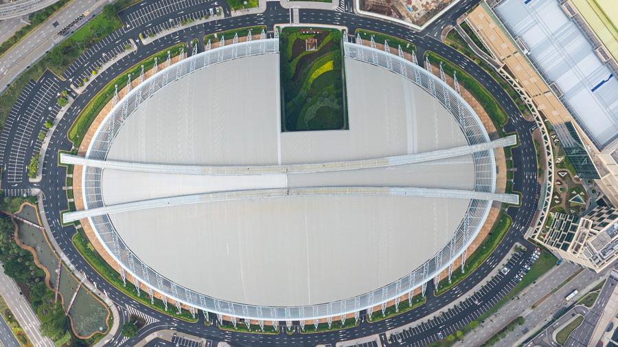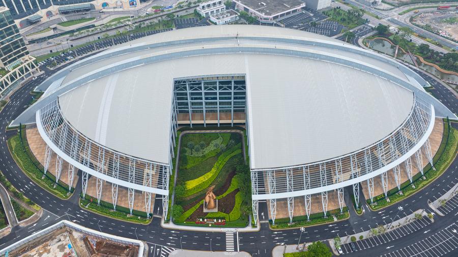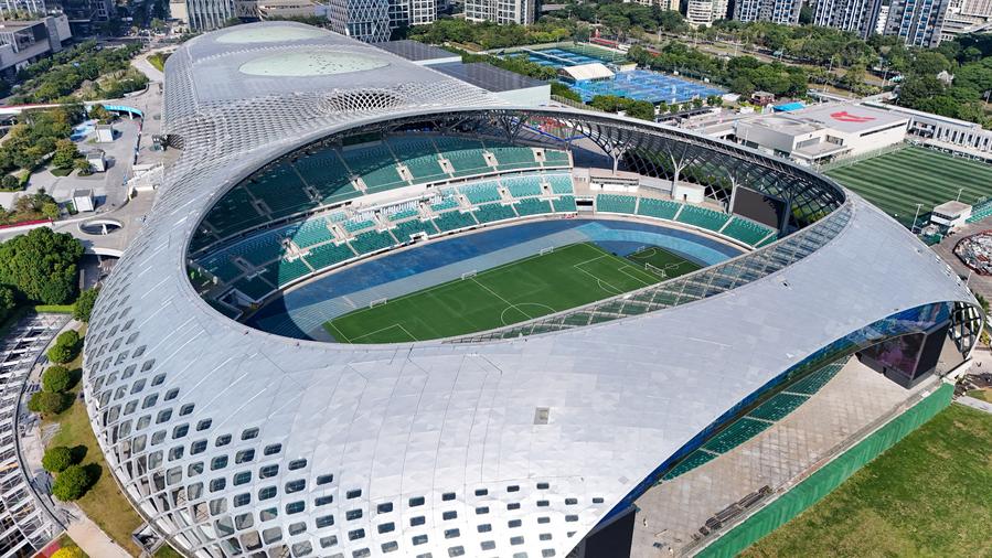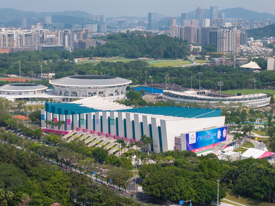 1日、第15回全国運動会でバスケットボール女子U22(22歳以下)、マラソンの会場となる広東省深圳市の深圳湾スポーツセンター。(ドローンから、深圳=新華社記者/梁旭)