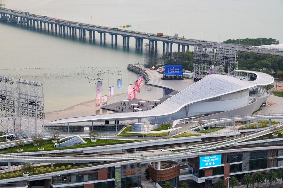 第15回全国運動会でテニスの会場となる広東省珠海市の珠海横琴国際テニスセンター。(10月18日、ドローンから、珠海=新華社記者/鄧華)