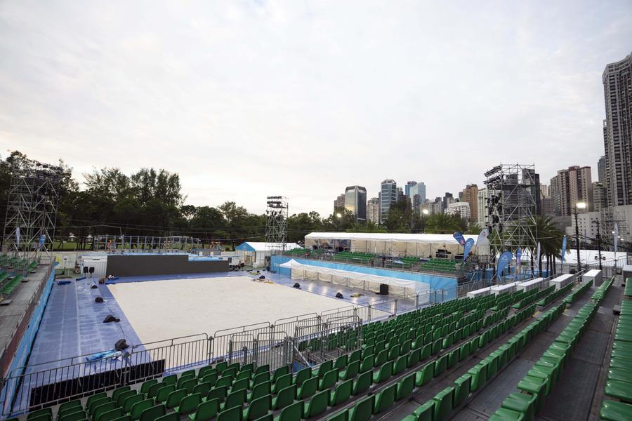10月25日、第15回全国運動会でビーチバレーの会場となる香港ビクトリアパーク。(香港=新華社配信/呂小煒)