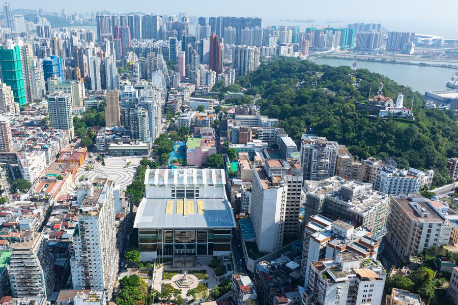第15回全国運動会で5人制バスケットボール男子U18(18歳以下)の会場となるマカオ塔石体育館。(10月17日、ドローンから、マカオ=新華社配信/張金加)