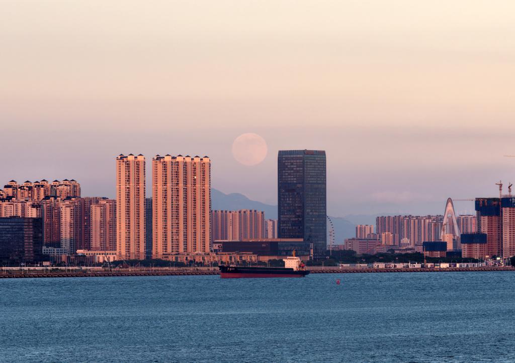 5日、広東省汕頭市の空に輝く満月。(ドローンから、汕頭=新華社配信/姚軍)