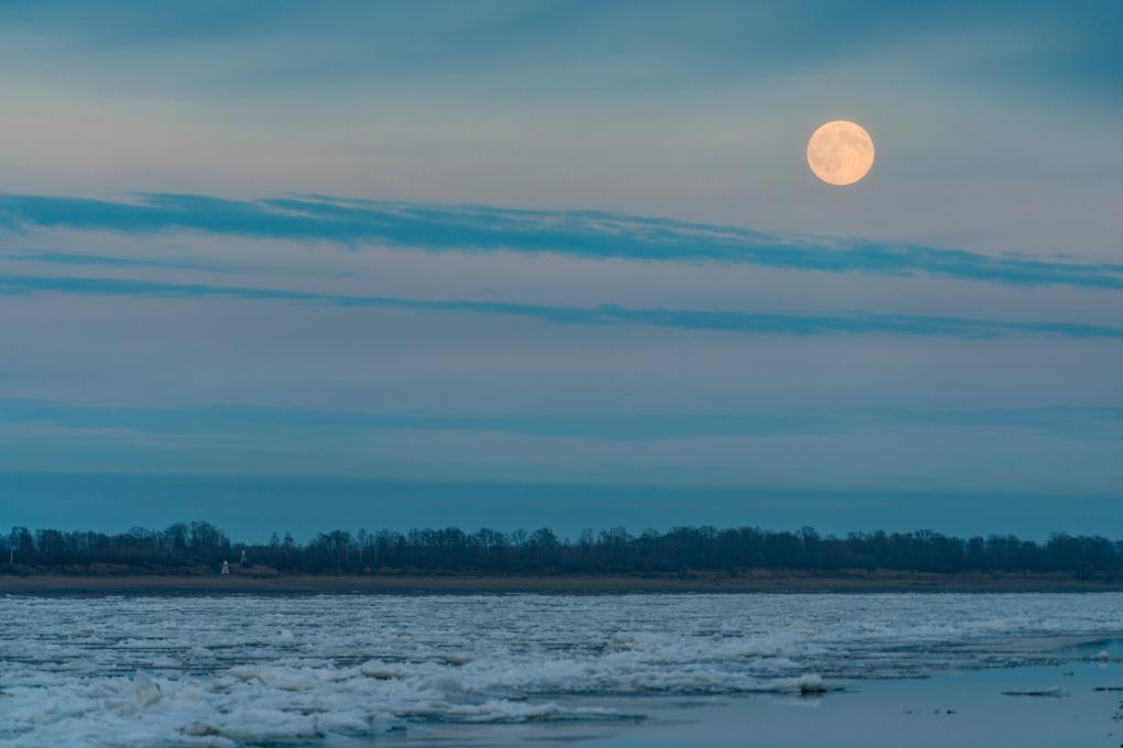 5日、黒竜江省伊春市嘉蔭(かえい)県を流れる黒竜江の嘉蔭区間で輝く満月。(伊春=新華社記者/謝剣飛)
