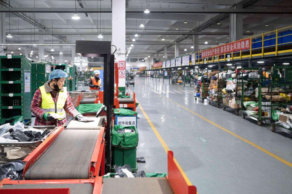 10日、中国郵政集団黒竜江省ハルビン郵区センターで荷物を仕分けるスタッフ。(ハルビン=新華社記者/張濤)