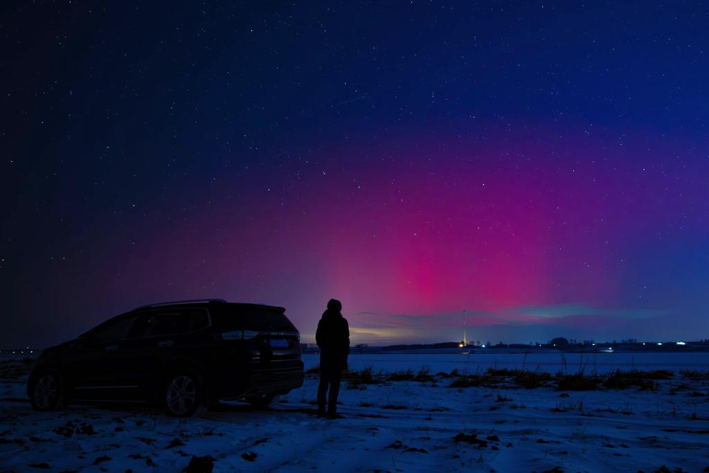 12日、黒竜江省黒河市にある北大荒集団北安分公司の長水河農場で、オーロラを観賞する写真愛好家。(黒河=新華社配信/銭泊羽)