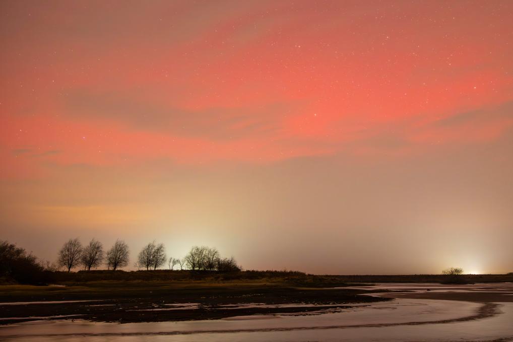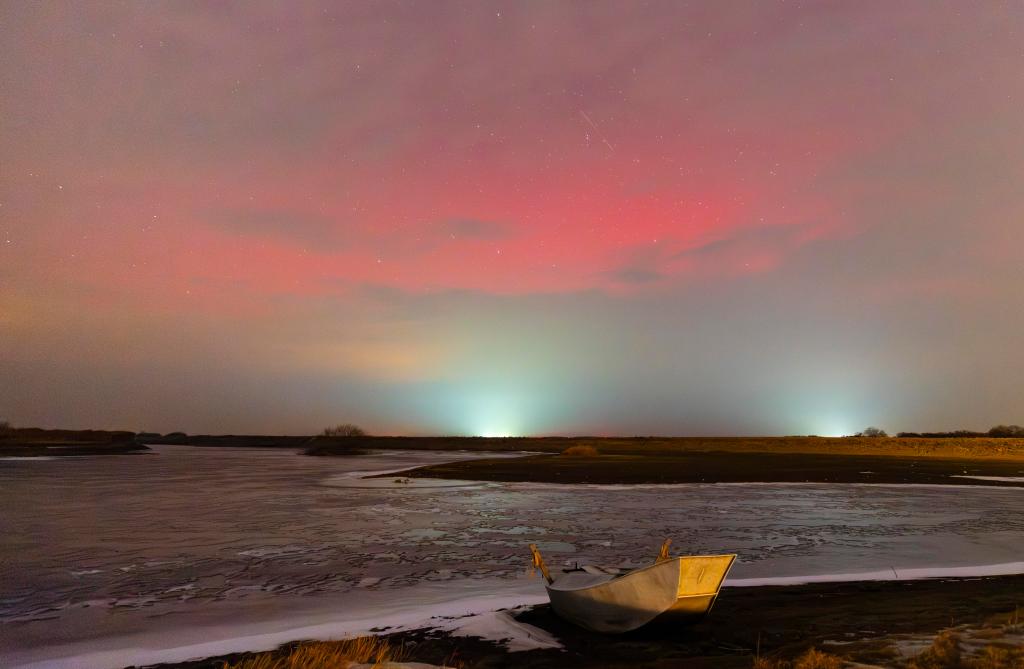 13日、黒竜江省ハルビン市を流れる呼蘭河のほとりで撮影したオーロラ。(ハルビン=新華社配信/李鑫)