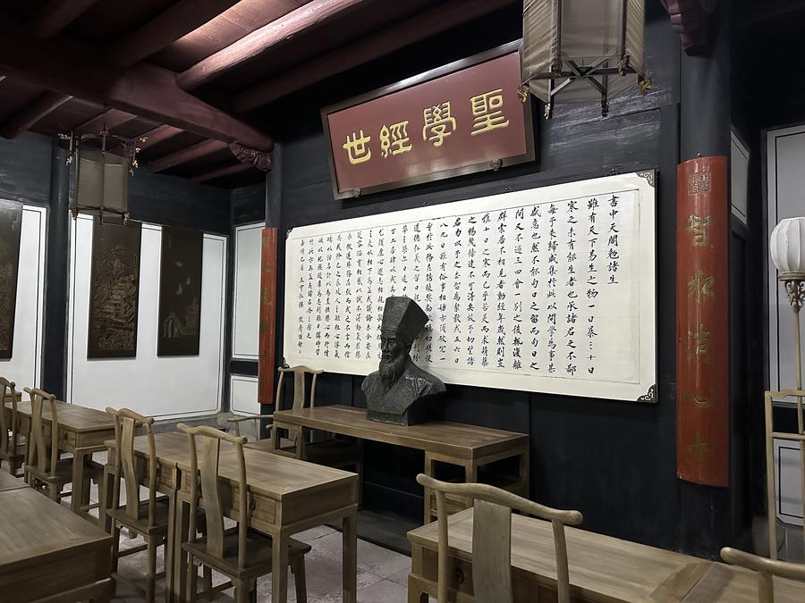 正門や階段、講堂などの建築が良好な状態で残されているほか、講堂の両側には王陽明の事績を紹介する展示室が設けられている。展示や壁画を通じ、王陽明が余姚で展開した講義活動や「心学」思想が分かりやすく紹介されている。(記者/許舜達、馬江)