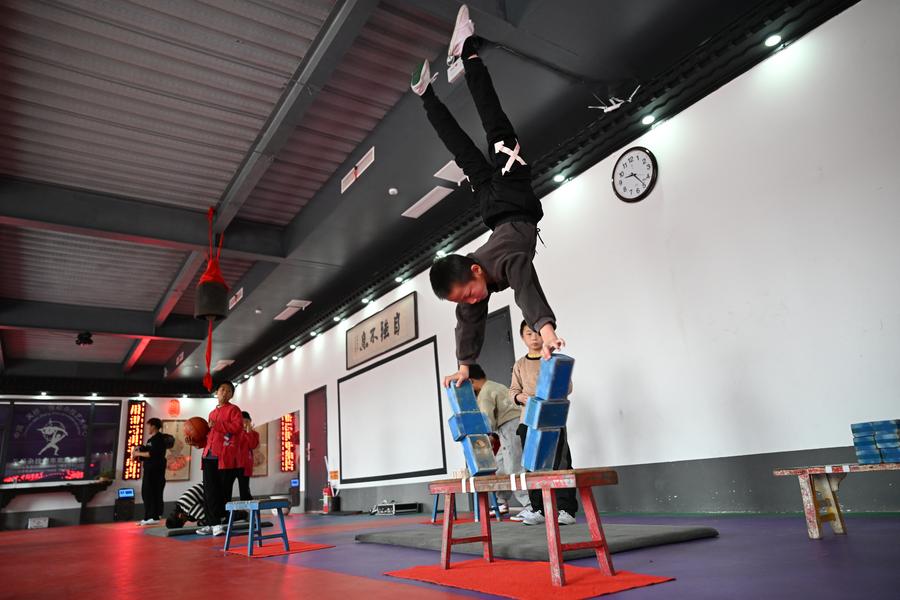 10月28日、河北省滄州市呉橋県の大運河堤頂路沿いにある張碩雑技小院で雑技の練習をする子ども。(石家荘=新華社記者/牟宇)