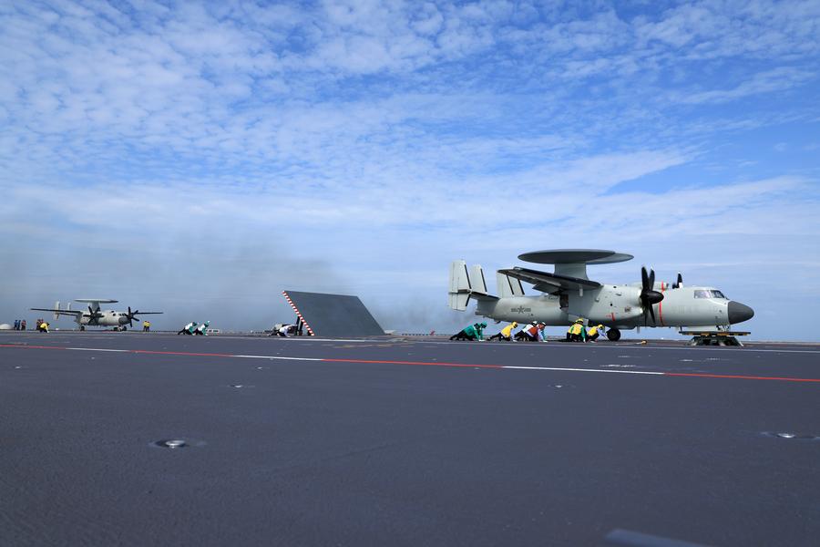 電磁式カタパルト(射出機)で連続して発艦する艦載早期警戒機「空警-600(KJ600)」。(三亜=新華社配信)