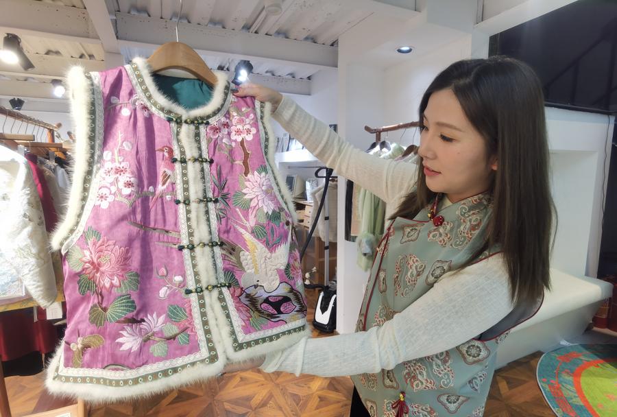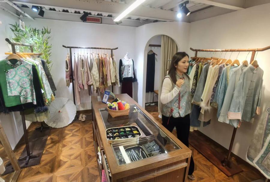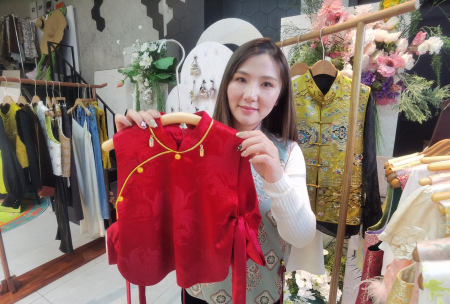 外国人に好まれる「新中式」の服飾品を見せる服飾店「見己中式美学」の創業者、張夢婷(ちょう・むてい)さん。(済南=新華社記者/王凱)