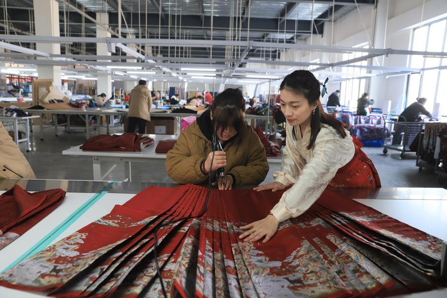 曹県にある漢服工場で縫製作業をするスタッフ。(済南=新華社配信)