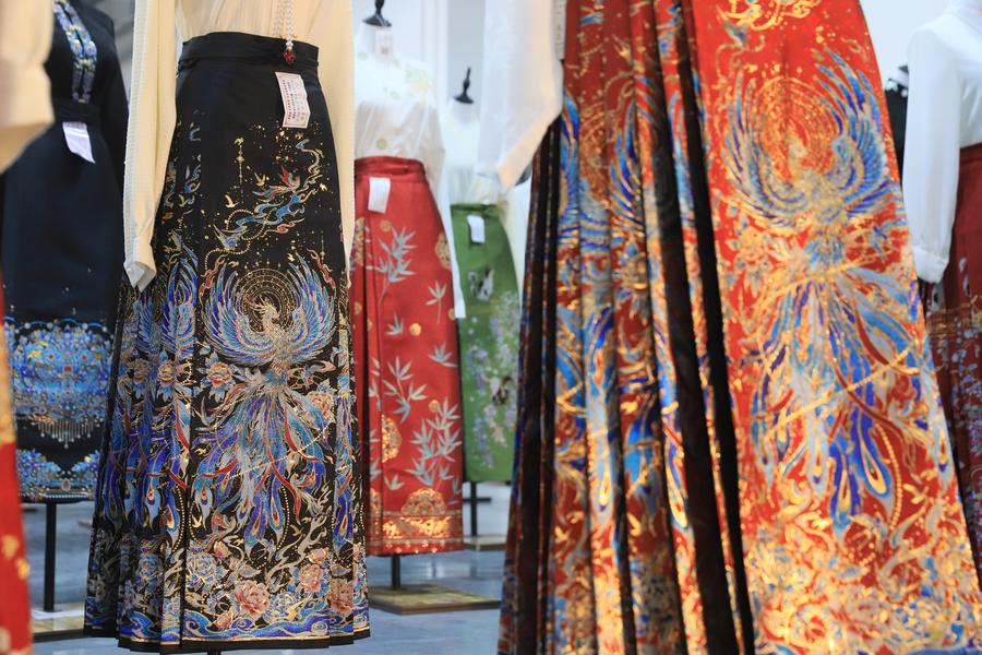 曹県にある有愛雲倉漢服基地で展示されている漢服。(済南=新華社配信)