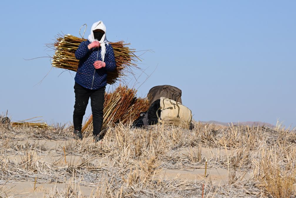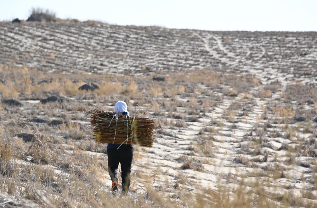オンニュド旗阿什罕蘇木(ソム)で黄柳の苗を背負って運ぶ住民。(11月14日撮影、赤峰=新華社記者/賈立君)