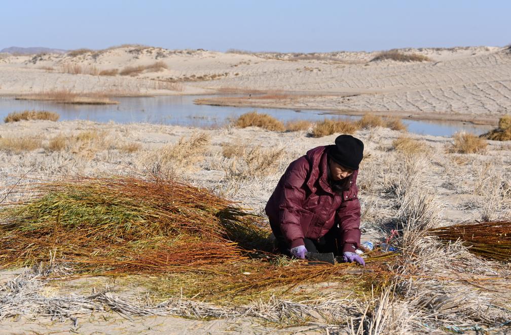 オンニュド旗で、わらなどを地面に格子状に埋め込んで砂の移動を防ぐ「草方格」の中に黄柳の苗を植える住民。(11月14日撮影、赤峰=新華社記者/賈立君)