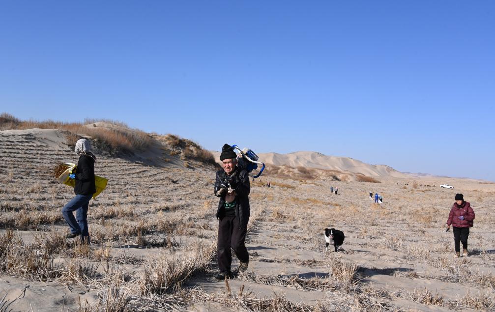 植林道具を担いでホルチン砂地に入り黄柳を植える準備をするオンニュド旗阿什罕蘇木(ソム)の牧畜民。(11月14日撮影、赤峰=新華社記者/賈立君)