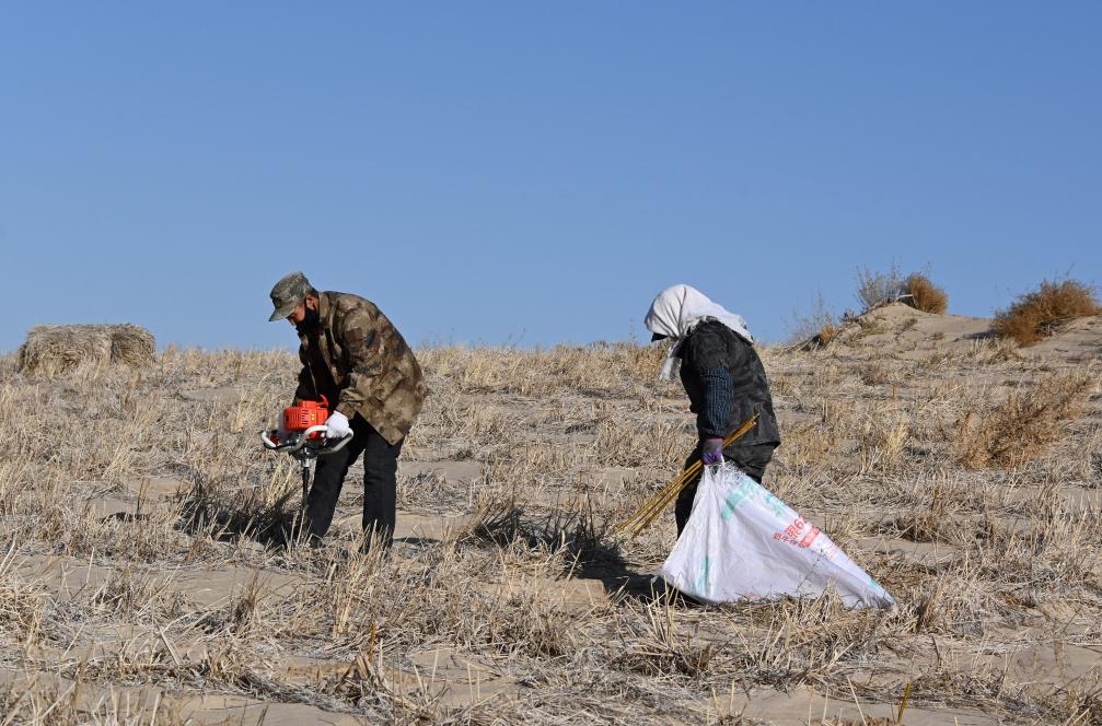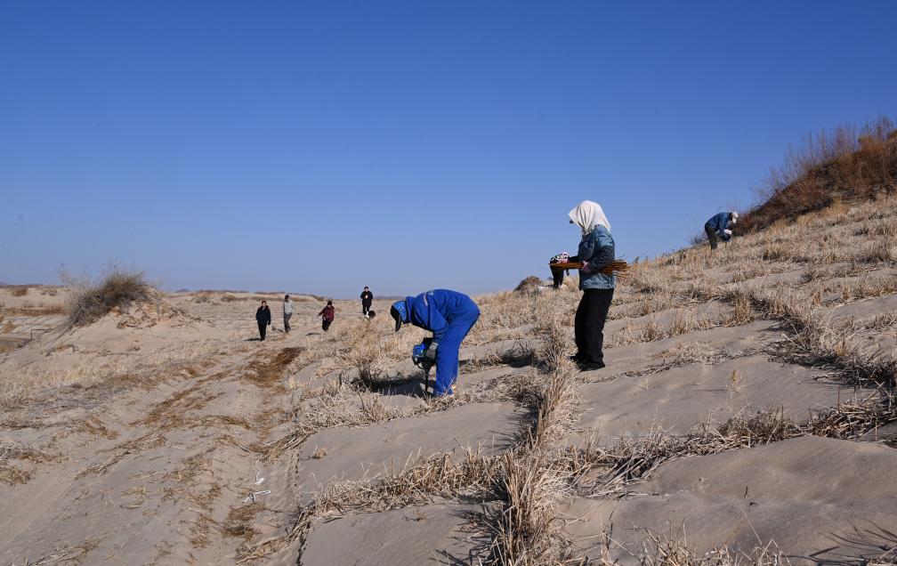 わらなどを地面に格子状に埋め込んで砂の移動を防ぐ「草方格」の中に黄柳の苗を植えるオンニュド旗阿什罕蘇木(ソム)の牧畜民。(11月14日撮影、赤峰=新華社記者/賈立君)