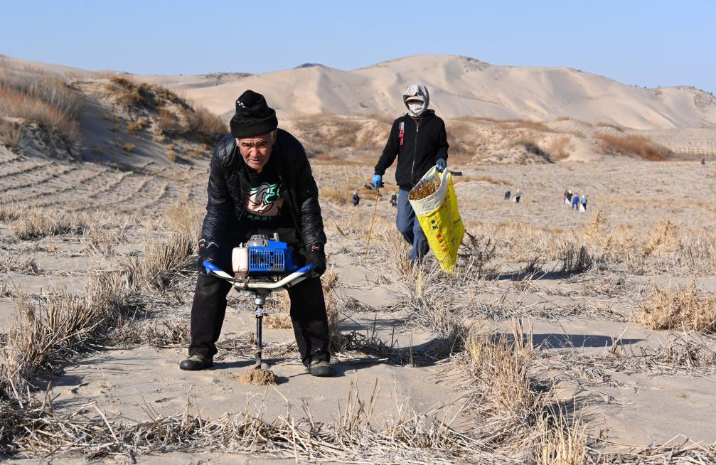 機械で砂地に植林用の穴を掘るオンニュド旗阿什罕蘇木(ソム)の牧畜民。(11月14日撮影、赤峰=新華社記者/賈立君)