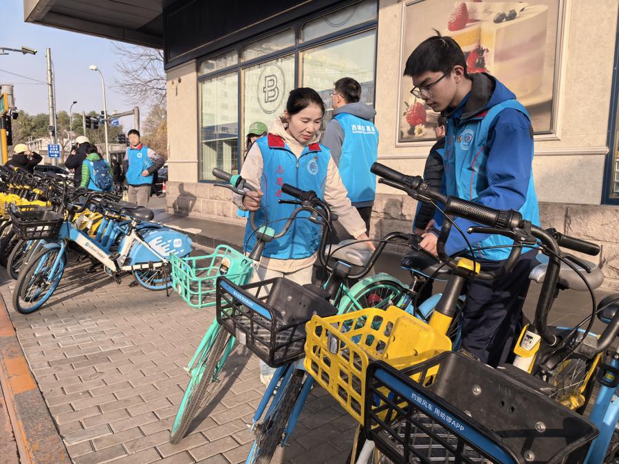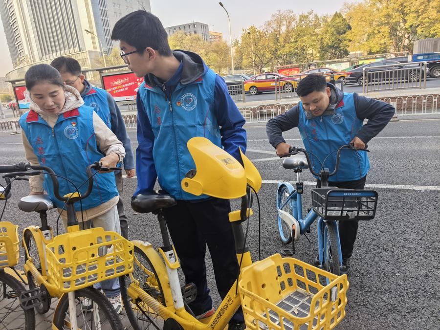 23日、シェアサイクルの整理を行うボランティア。(北京=新華社配信)