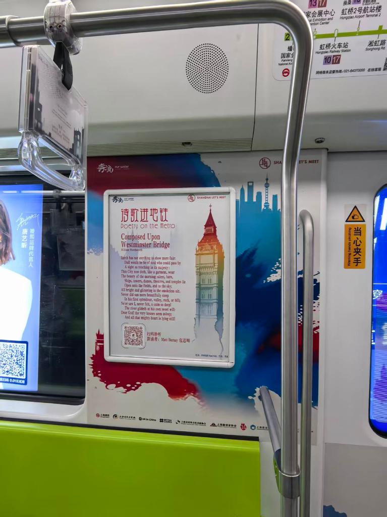 「詩歌を地下鉄に」は上海地下鉄が長年取り組む公共文化プロジェクト。2006年にはロンドン地下鉄とも交流を始め、英国と中国の詩それぞれ4編を双方の地下鉄内に展示。高い宣伝効果が得られ、乗客にも好評だった。(記者/有之炘)
