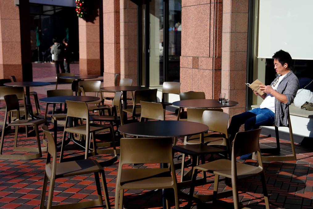 17日、東京都内のカフェを利用する男性。(東京=新華社記者/賈浩成)