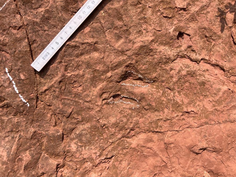 五岔恐竜足跡群で見つかった竜脚類恐竜の足跡。(北京=新華社配信)