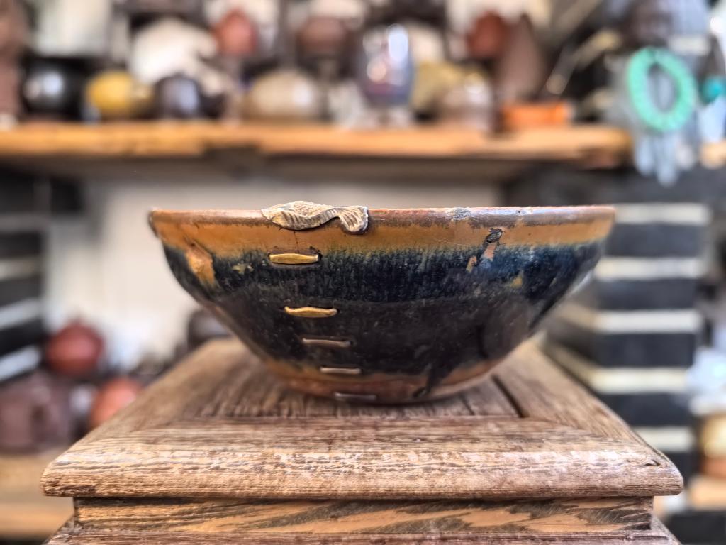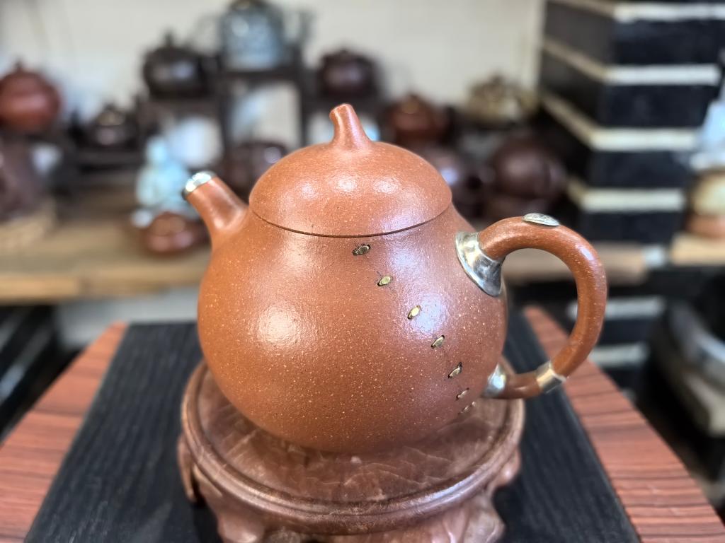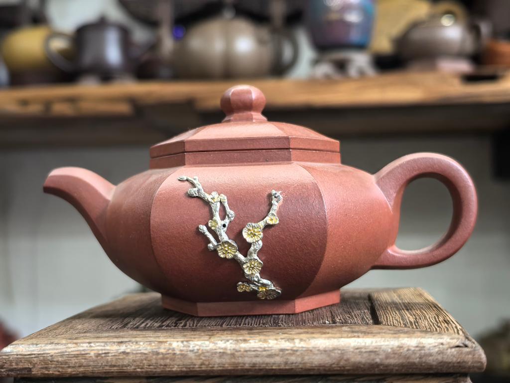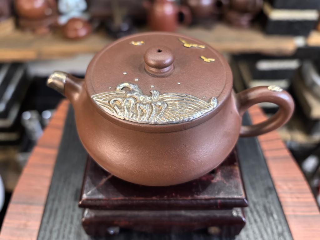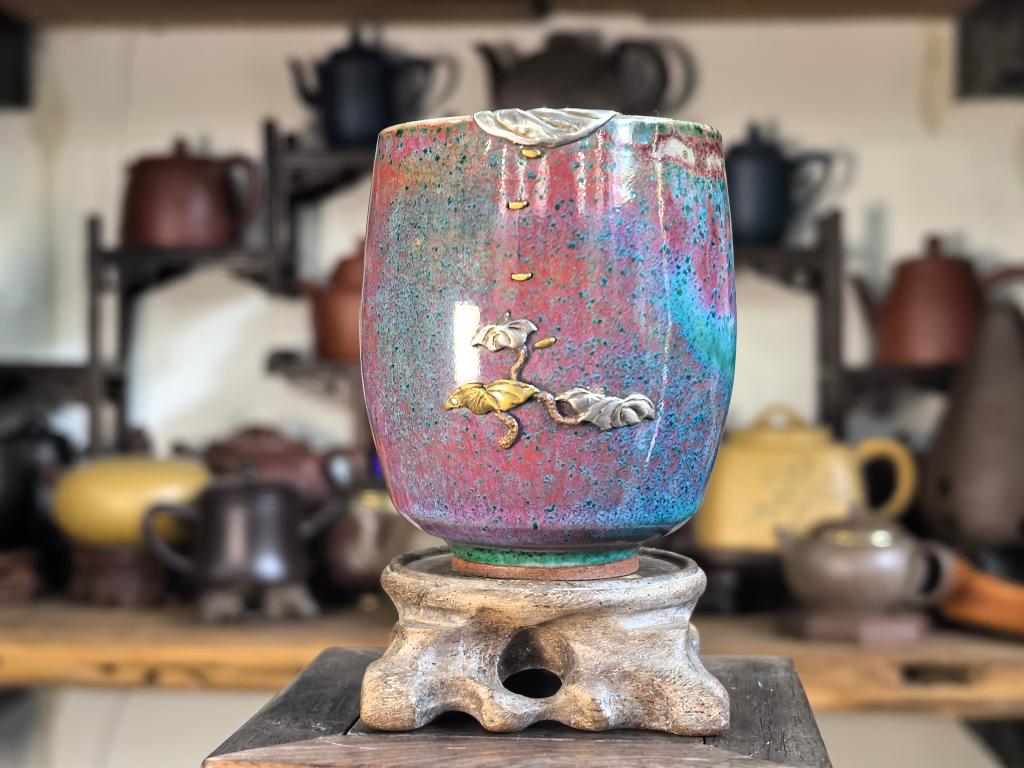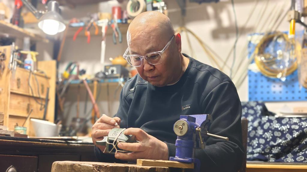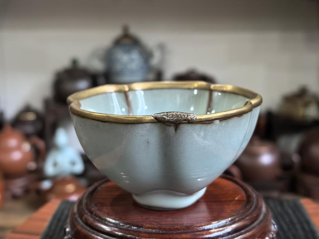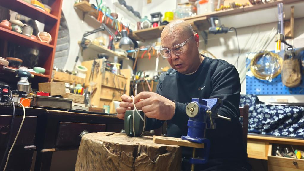 楊さんは「かつての鋦瓷は壊れた器を修理し、実用性を取り戻すだけのものだった。今は鎹止めや彫金などの技法を用いて二次創作を行い、器に新たな美を加えている」と語った。(記者/朱暁光)