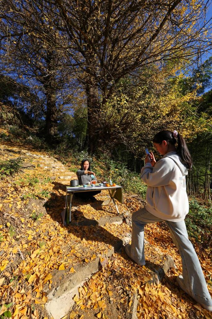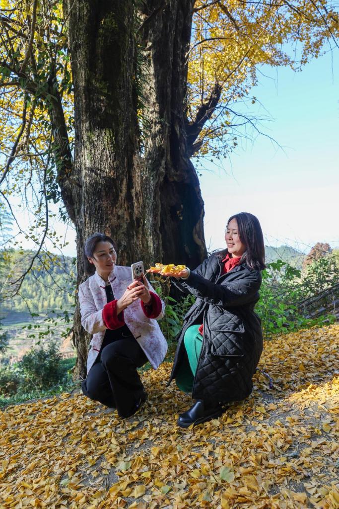 28日、福建省武夷山市呉屯郷后源村で、黄金色に染まったイチョウの葉を撮影する観光客。(武夷山=新華社配信/邱汝泉)