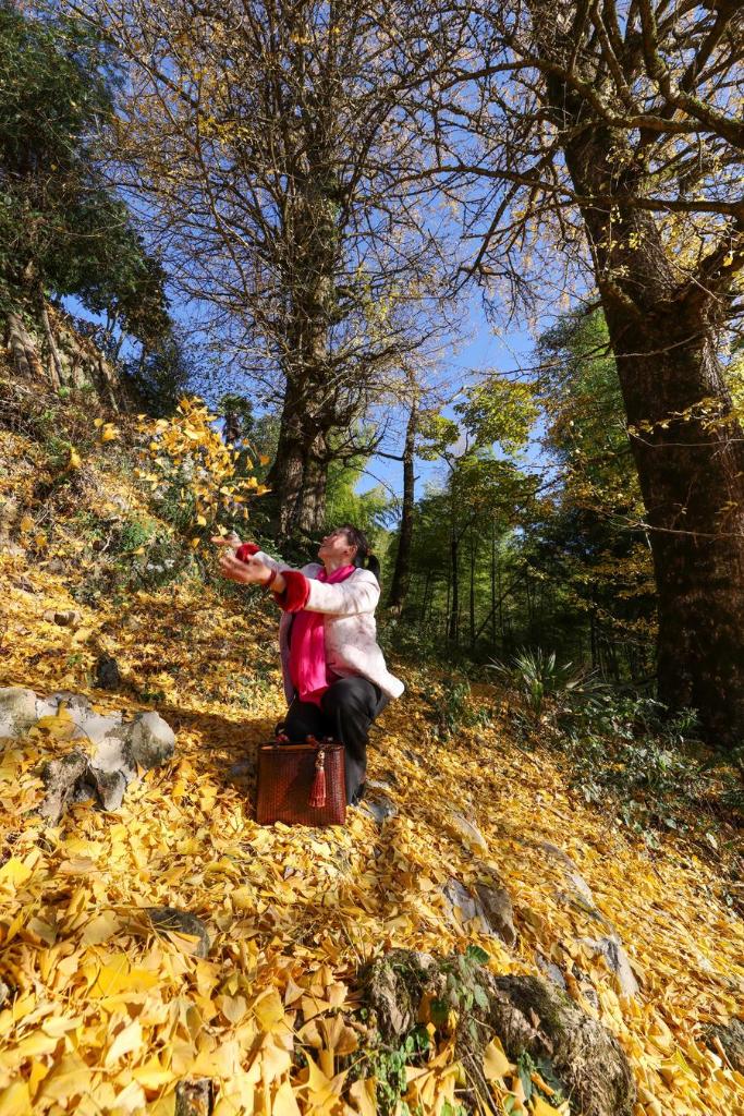 28日、福建省武夷山市呉屯郷后源村で、黄金色に染まったイチョウの葉と戯れる観光客。(武夷山=新華社配信/邱汝泉)