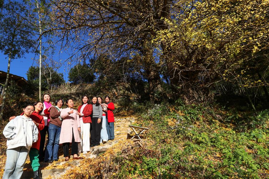 【新華社武夷山11月29日】中国福建省武夷山市の呉屯郷で、古木のイチョウの葉が黄金色に染まり、見頃を迎えている。多くの観光客が美しい風景を写真に収めていた。