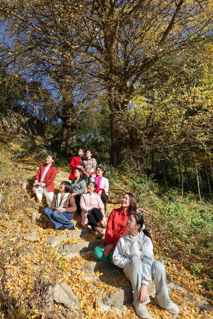 28日、福建省武夷山市呉屯郷后源村で、黄金色に染まったイチョウの古木を鑑賞する観光客。(武夷山=新華社配信/邱汝泉)