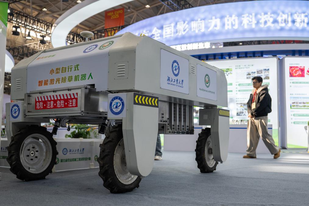29日、農業博覧会で展示されているスマートレーザー除草ロボット。(武漢=新華社記者/杜子璇)