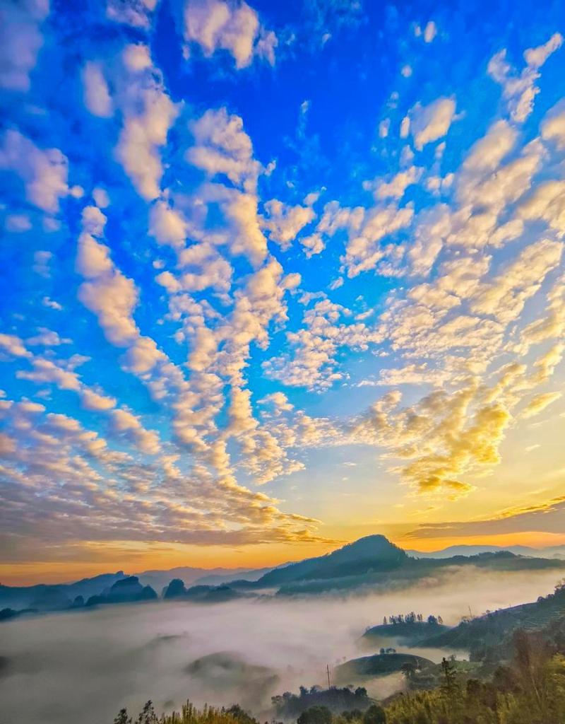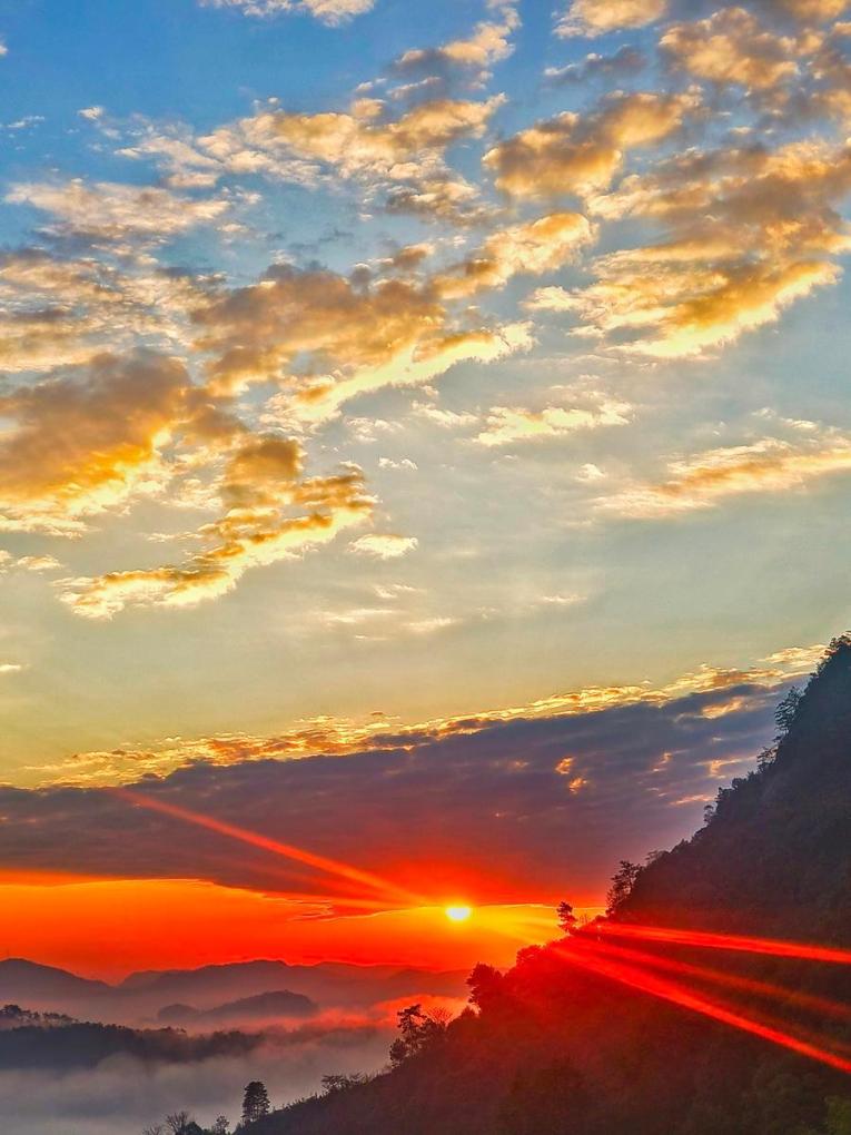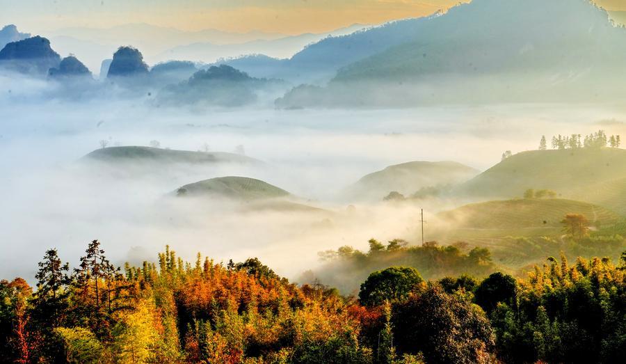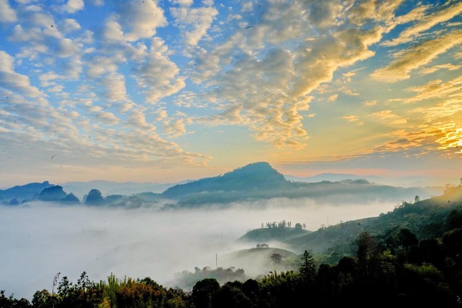 【新華社武夷山12月18日】中国福建省の武夷山国家公園で17日早朝、鮮やかな朝焼けが空を染めた。薄い霧の中で山影が見え隠れし、暖かな色合いの日差しが雲を照らす壮麗な光景が広がった。