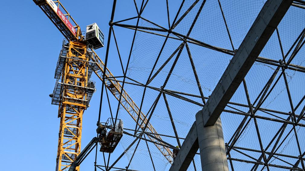 23日、南珠高速鉄道の岑溪東駅建設現場でボルトの締め付けを行う鉄骨組立工。(玉林=新華社記者/張愛林)