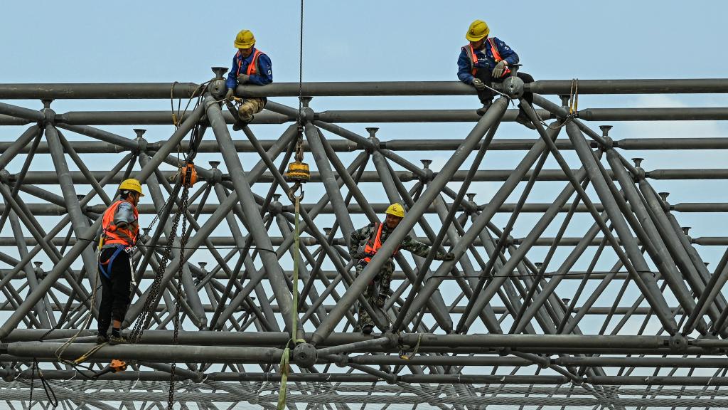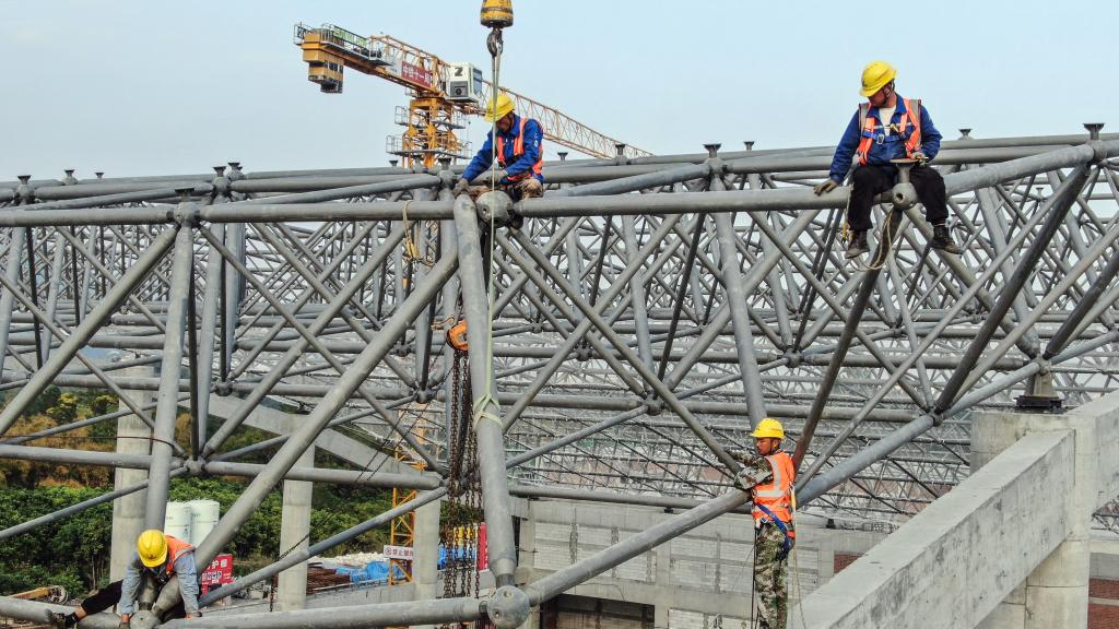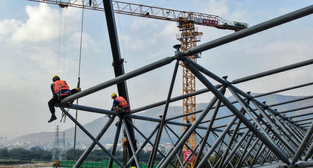 23日、南珠高速鉄道の岑溪東駅建設現場で共同作業を行う鉄骨組立工。(玉林=新華社記者/張愛林)